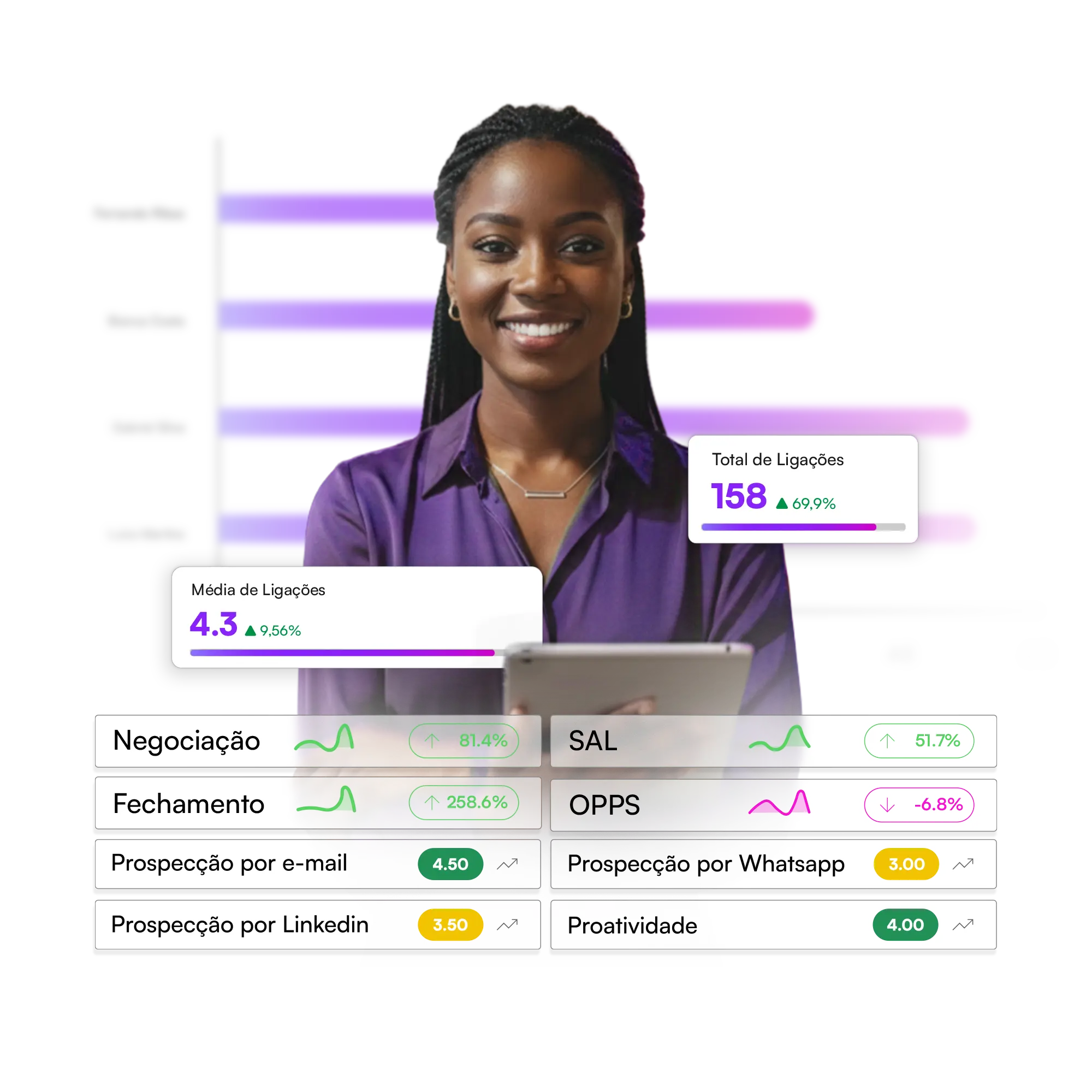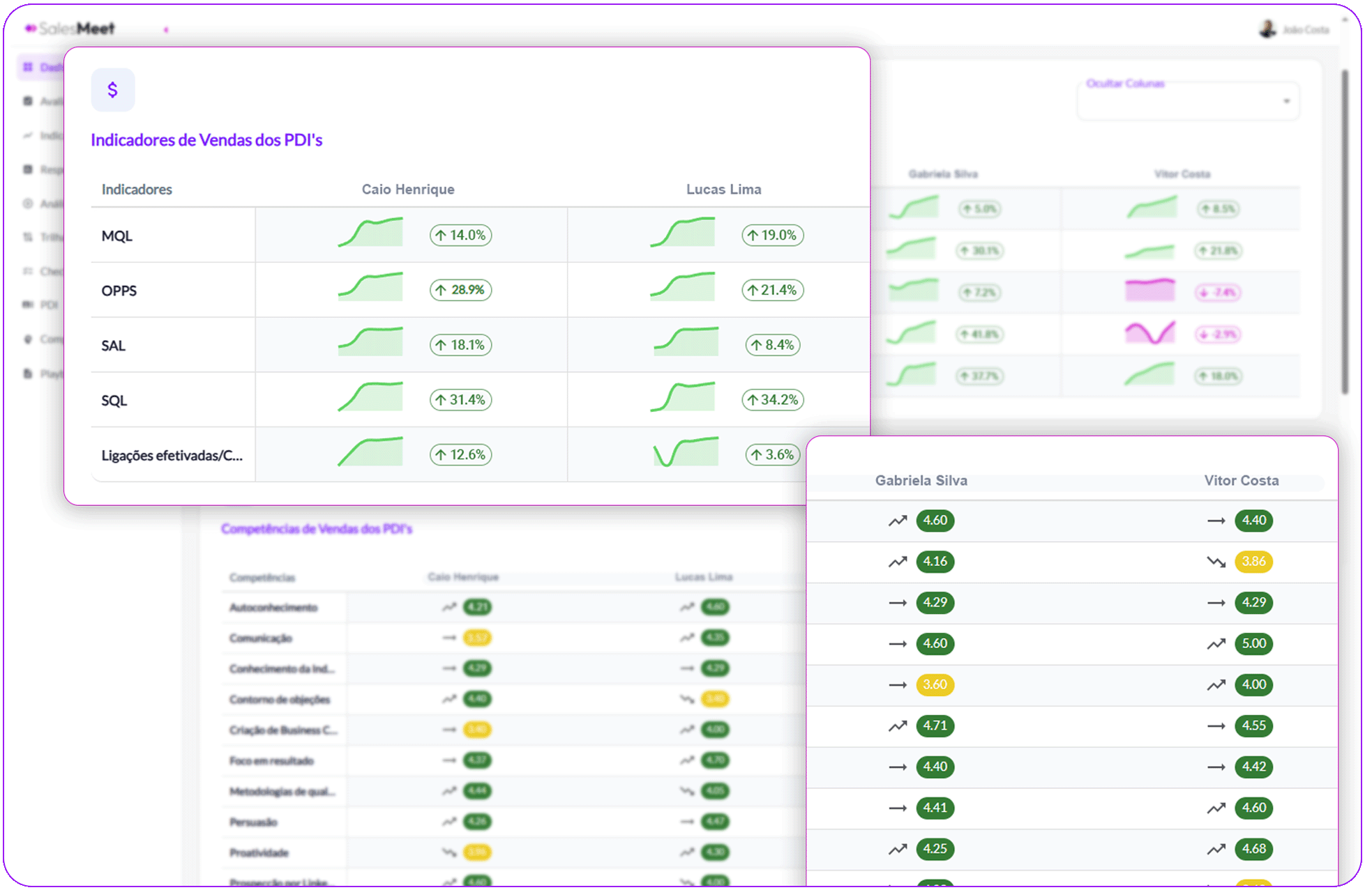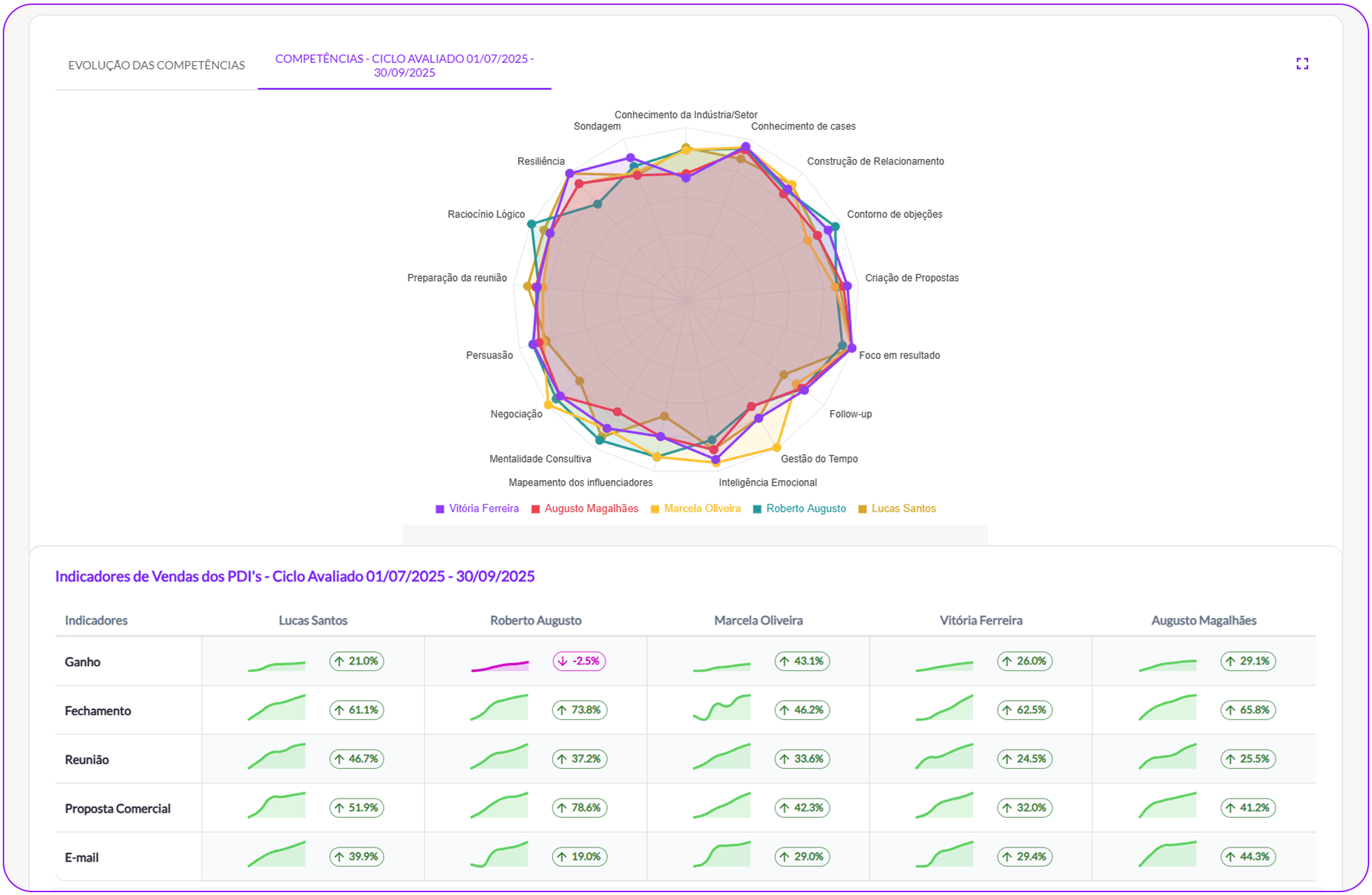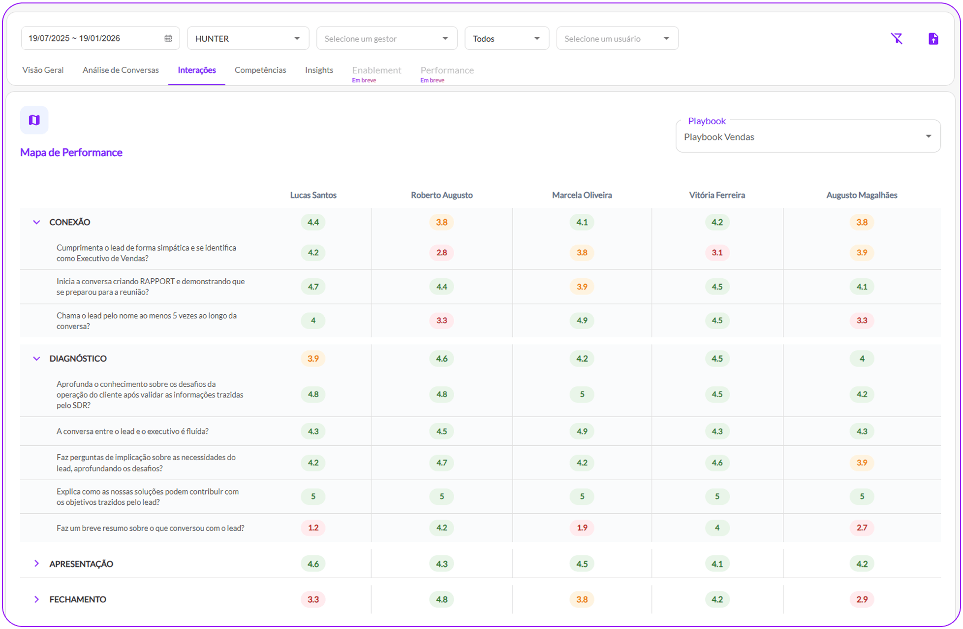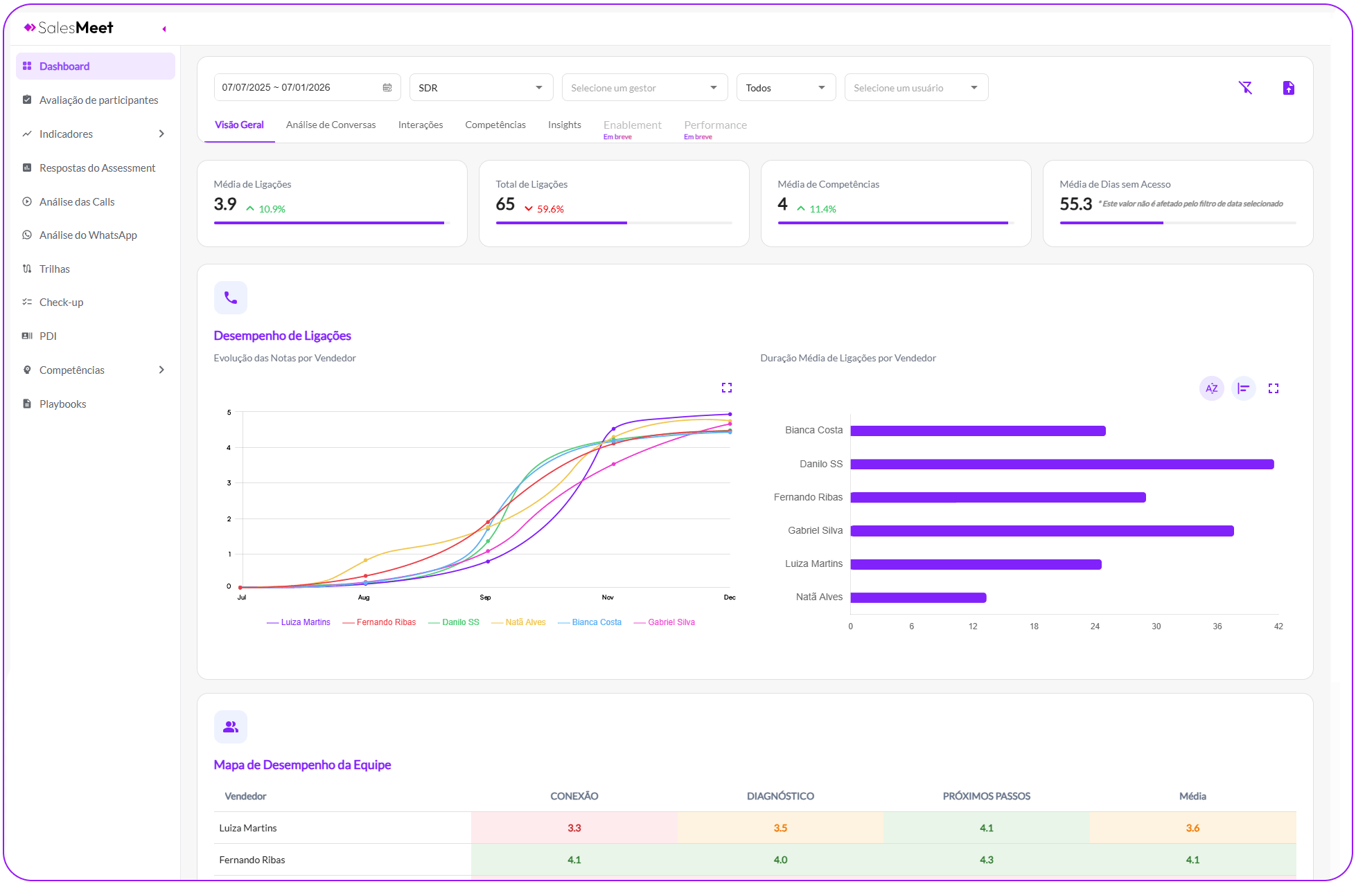 Acompanhe com rapidez e profundidade: mapa de desempenho, ranking de vendedores, evolução por indicadores, análise de competências e uma área exclusiva de Enablement com insights prontos para aplicar.Tudo o que você precisa para liderar com dados e acelerar resultados.