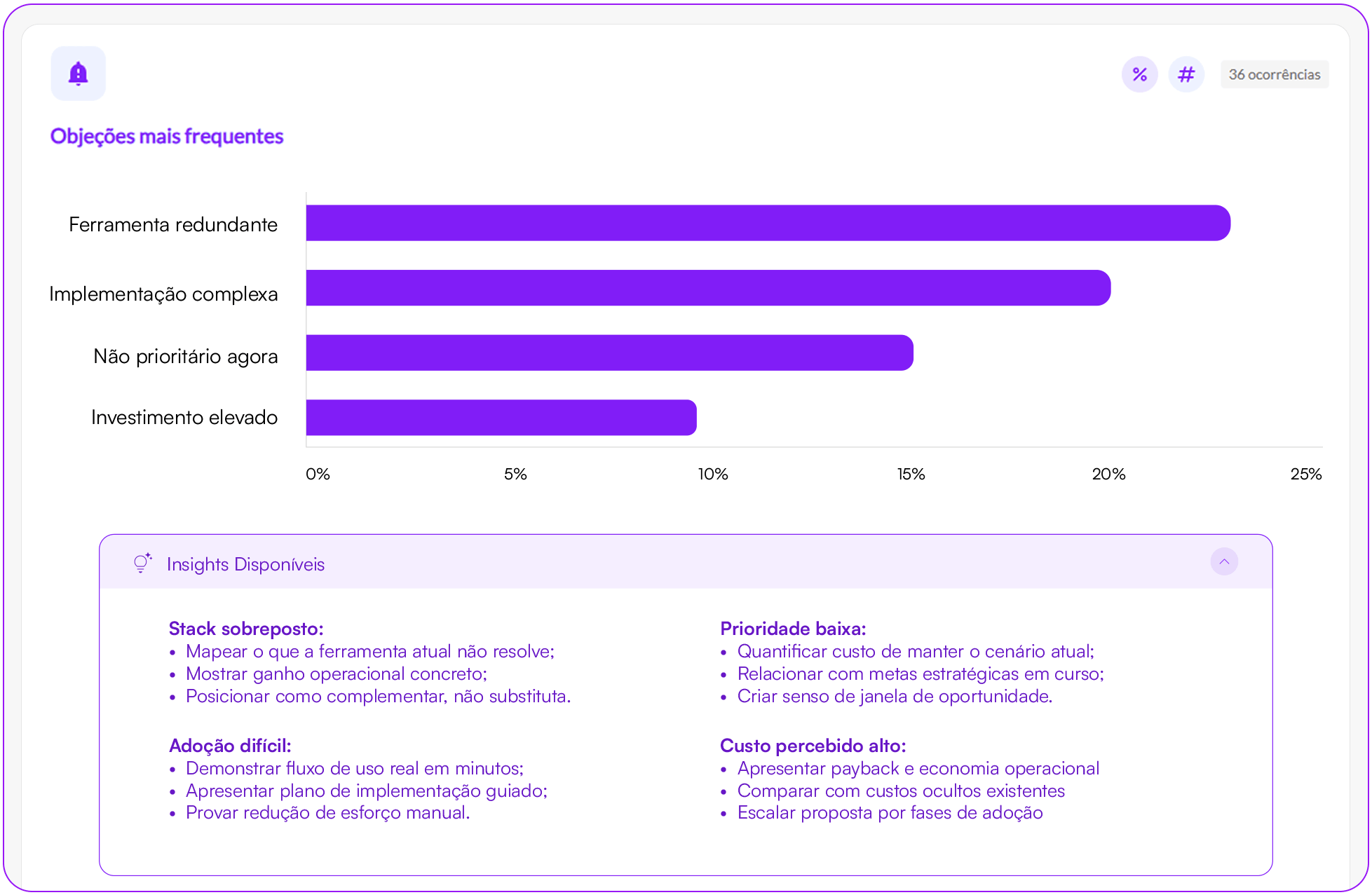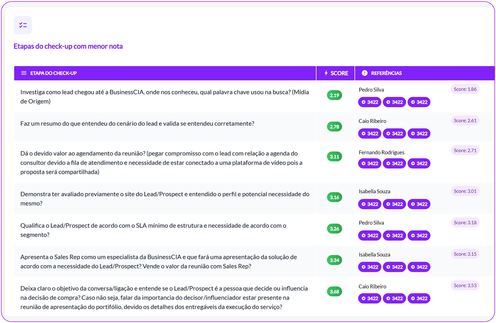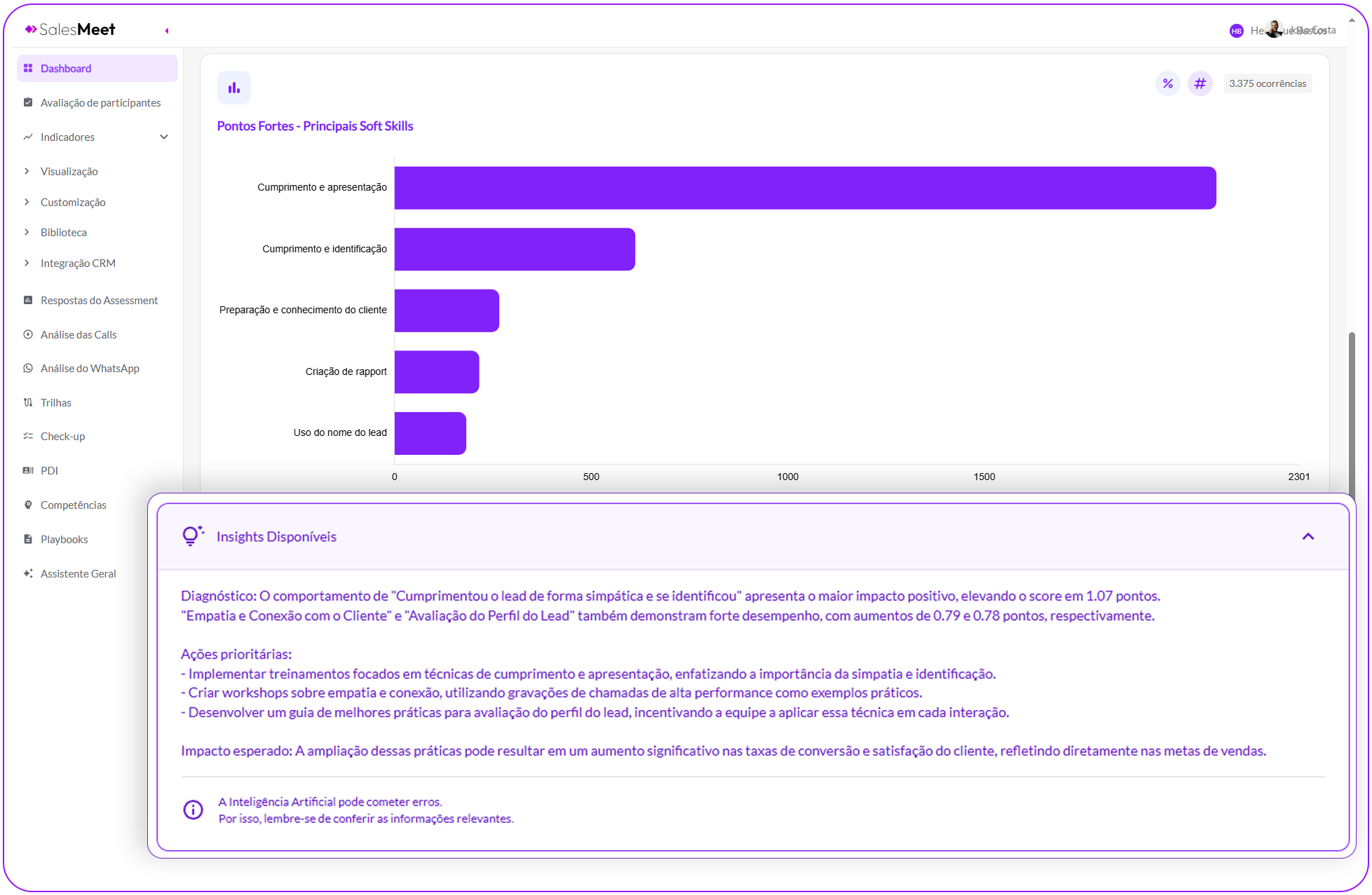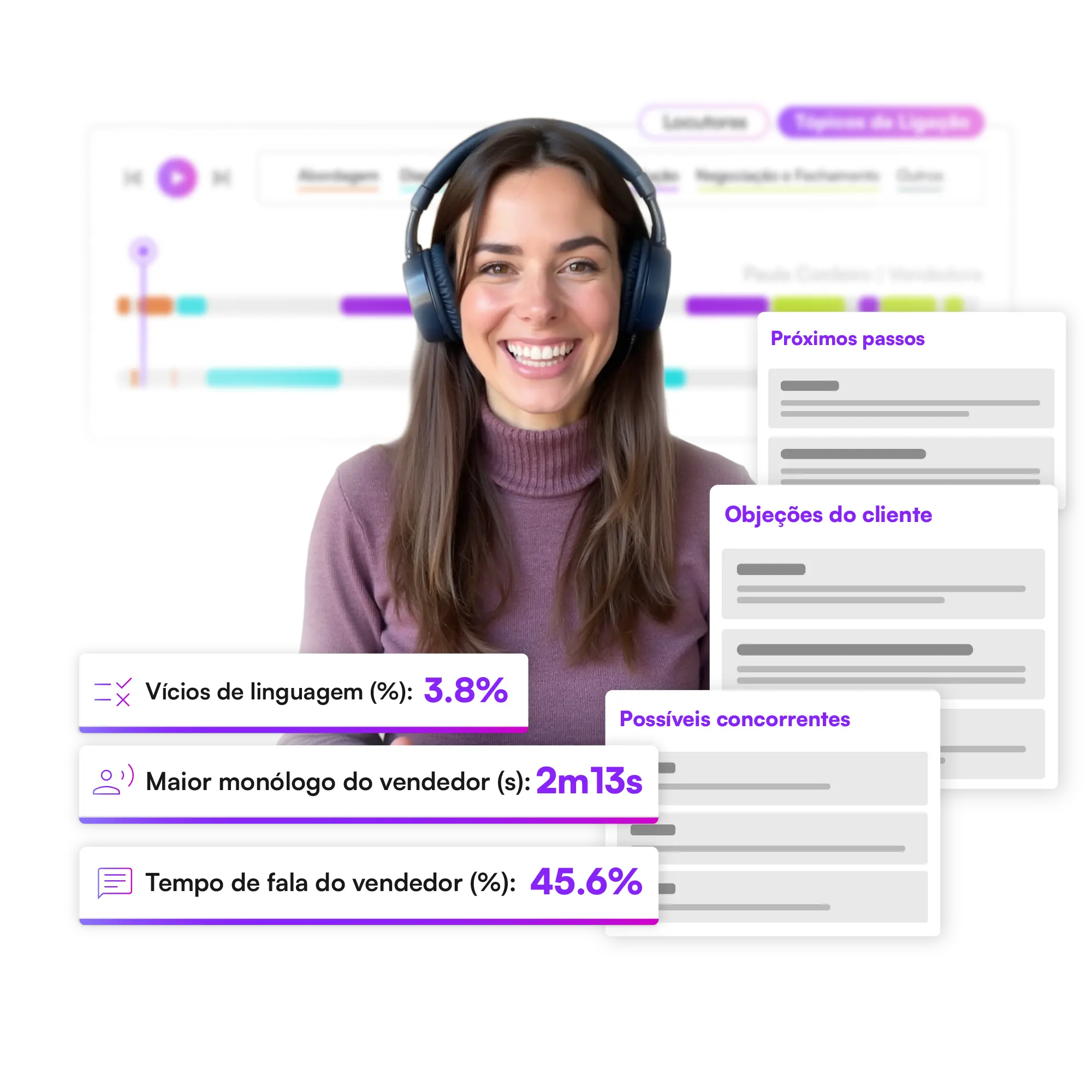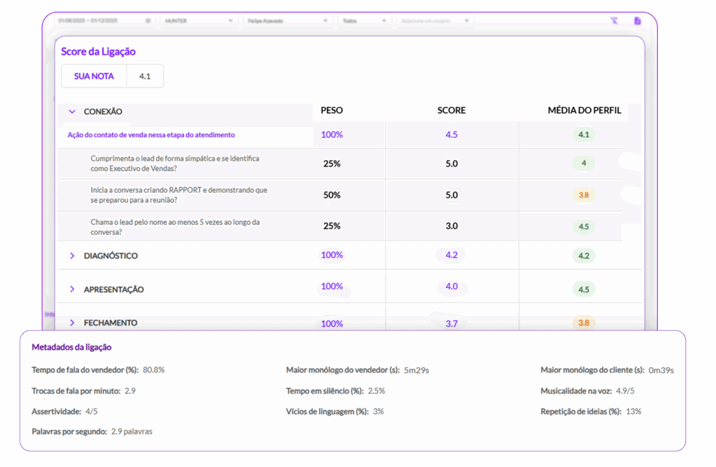 Receba análises detalhadas e sugestões personalizadas, geradas por inteligência artificial, para aprimorar a performance de cada vendedor. A única ferramenta que vai além do que é dito. Ela analisa como é dito: velocidade, ênfase, persuasão, prolixidade e muito mais.