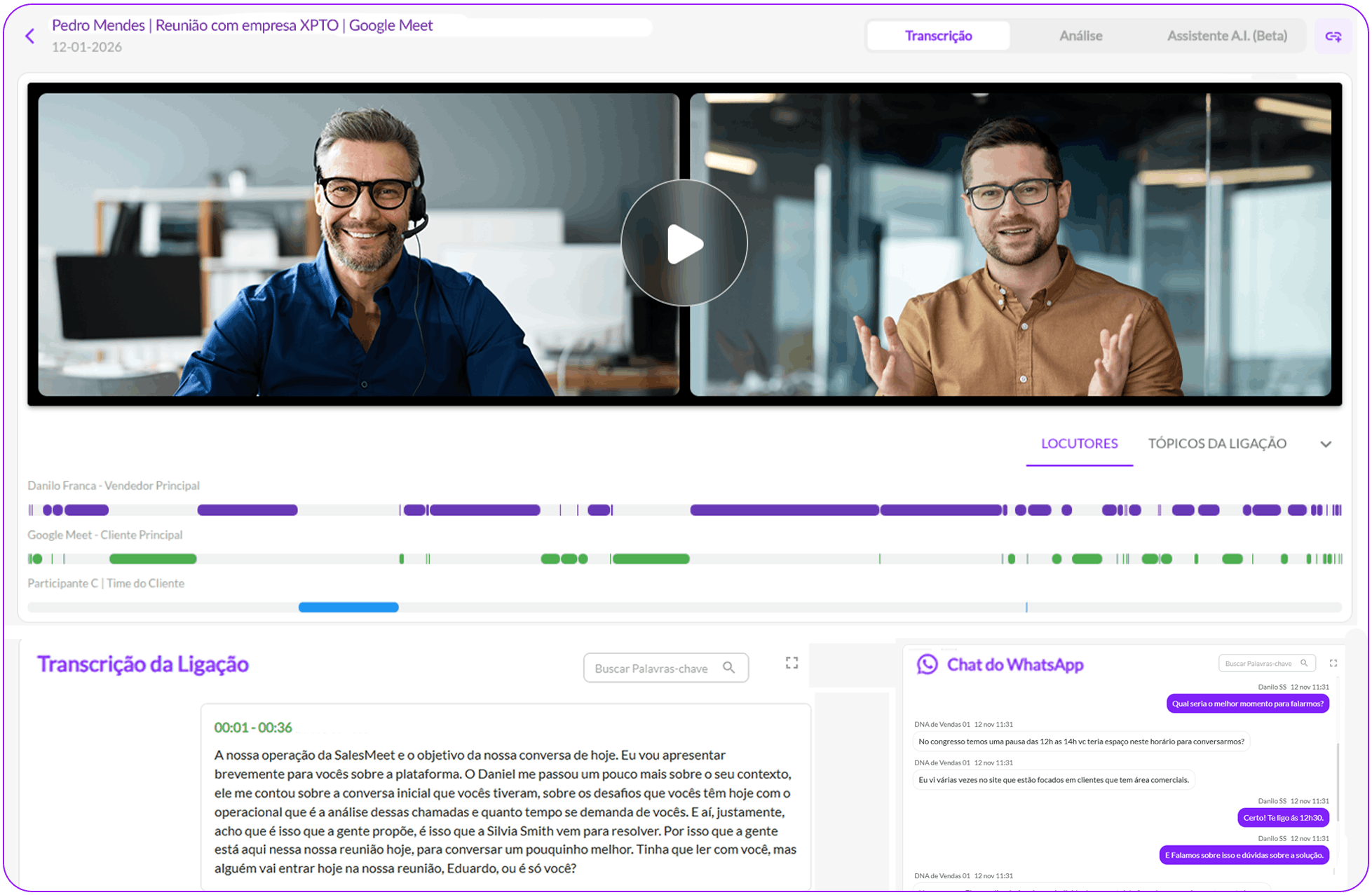 Grave, transcreva e analise - de acordo com o seu processo - calls de vendas automaticamente para identificar pontos fortes e oportunidades de melhoria com precisão.
