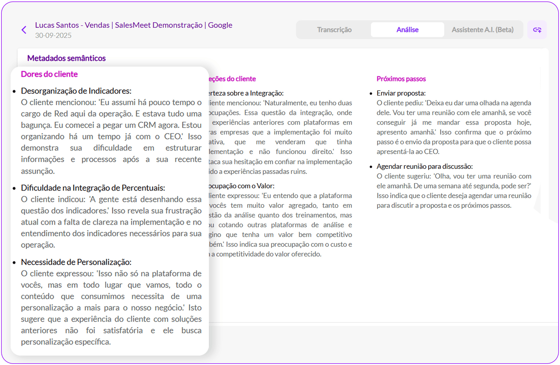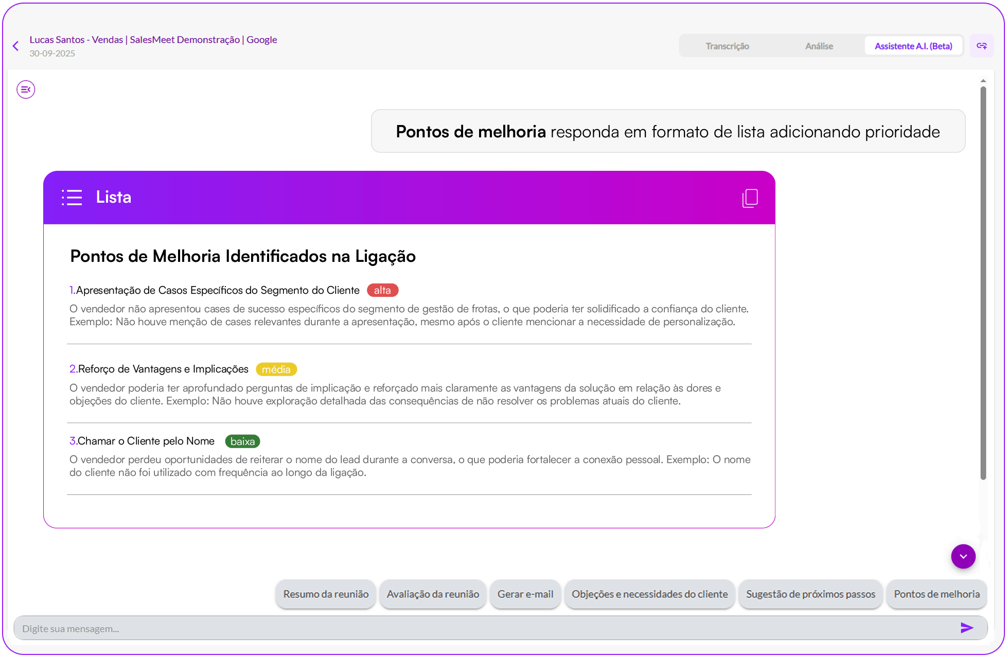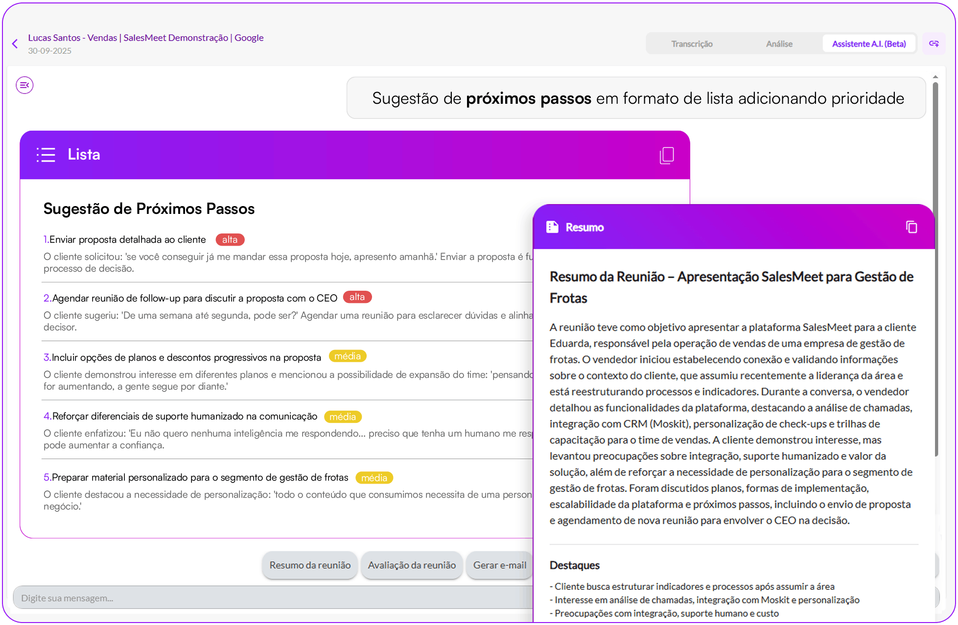 O Assistente de IA integrado em cada call ou reunião de vendas oferece resumos detalhados, próximos passos, objeções identificadas e pontos de melhoria. Ele também gera e-mails automaticamente, agilizando a comunicação. Com botões de perguntas rápidas, você pode acessar funcionalidades essenciais de forma prática, podendo detalhar comandos para maior assertividade.