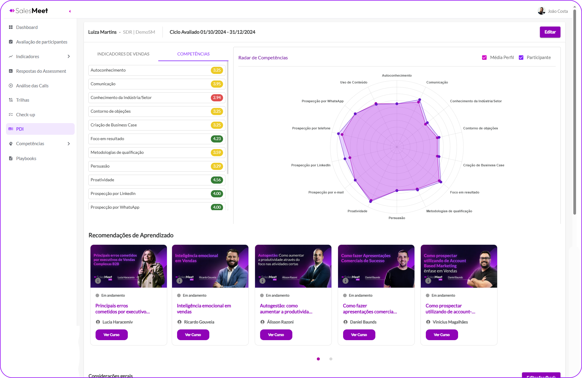 Sim. Todos os insights podem alimentar trilhas, PDIs e rotinas de capacitação na SalesMeet Edu.