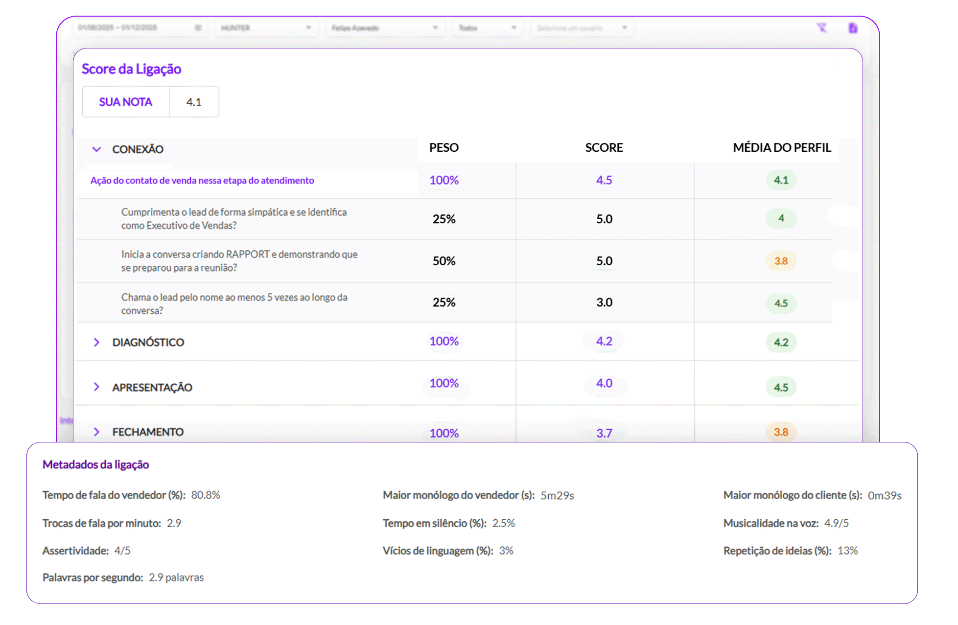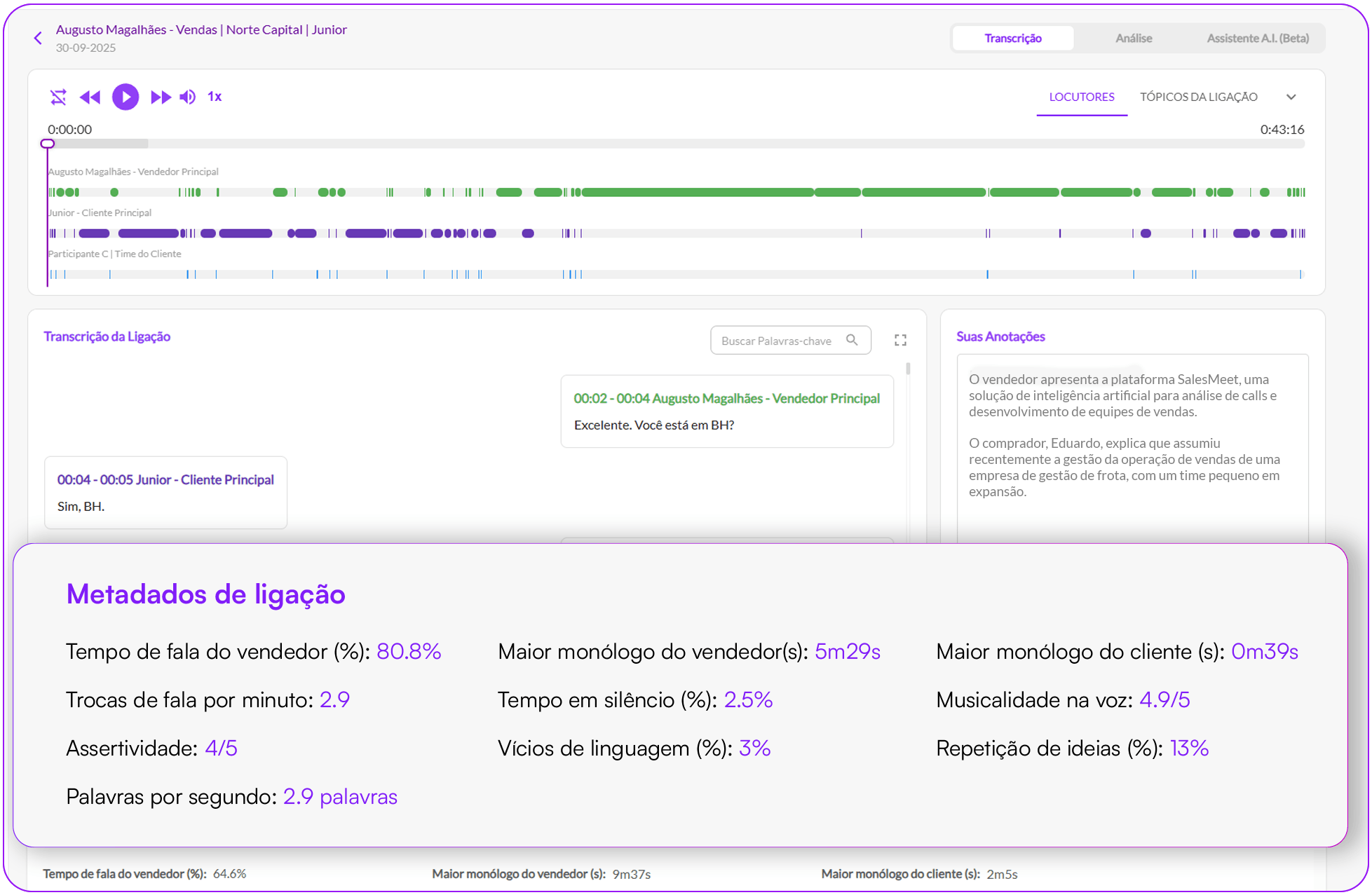 Nossa ferramenta analisa entonação, ritmo e musicalidade da voz, mede o grau de prolixidade, identifica repetições e vícios de linguagem, transformando cada interação em dados estratégicos para capacitar equipes de vendas, marketing, produto e CS.
