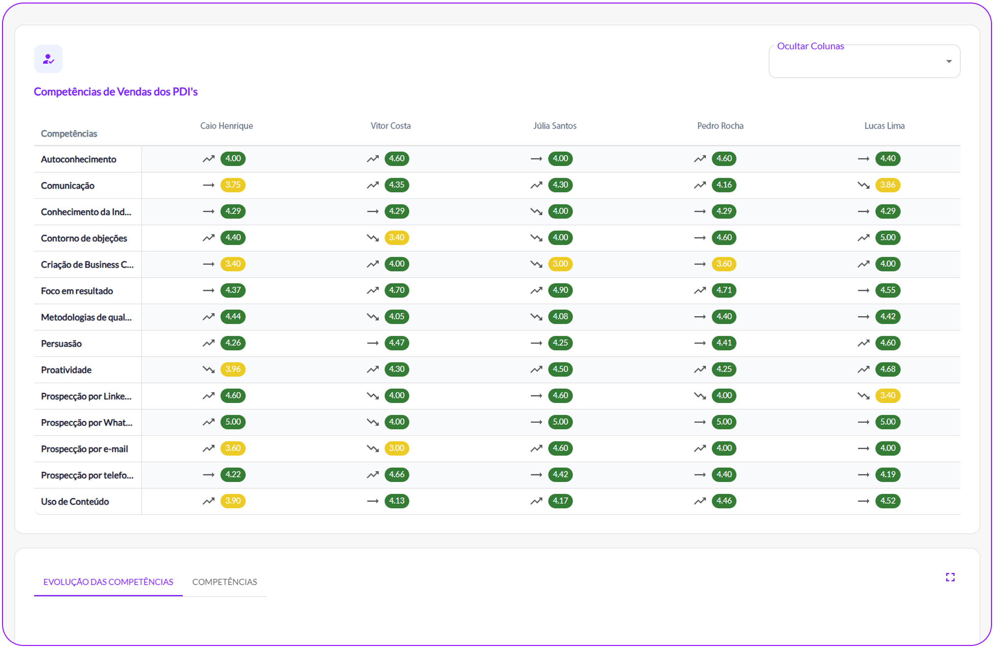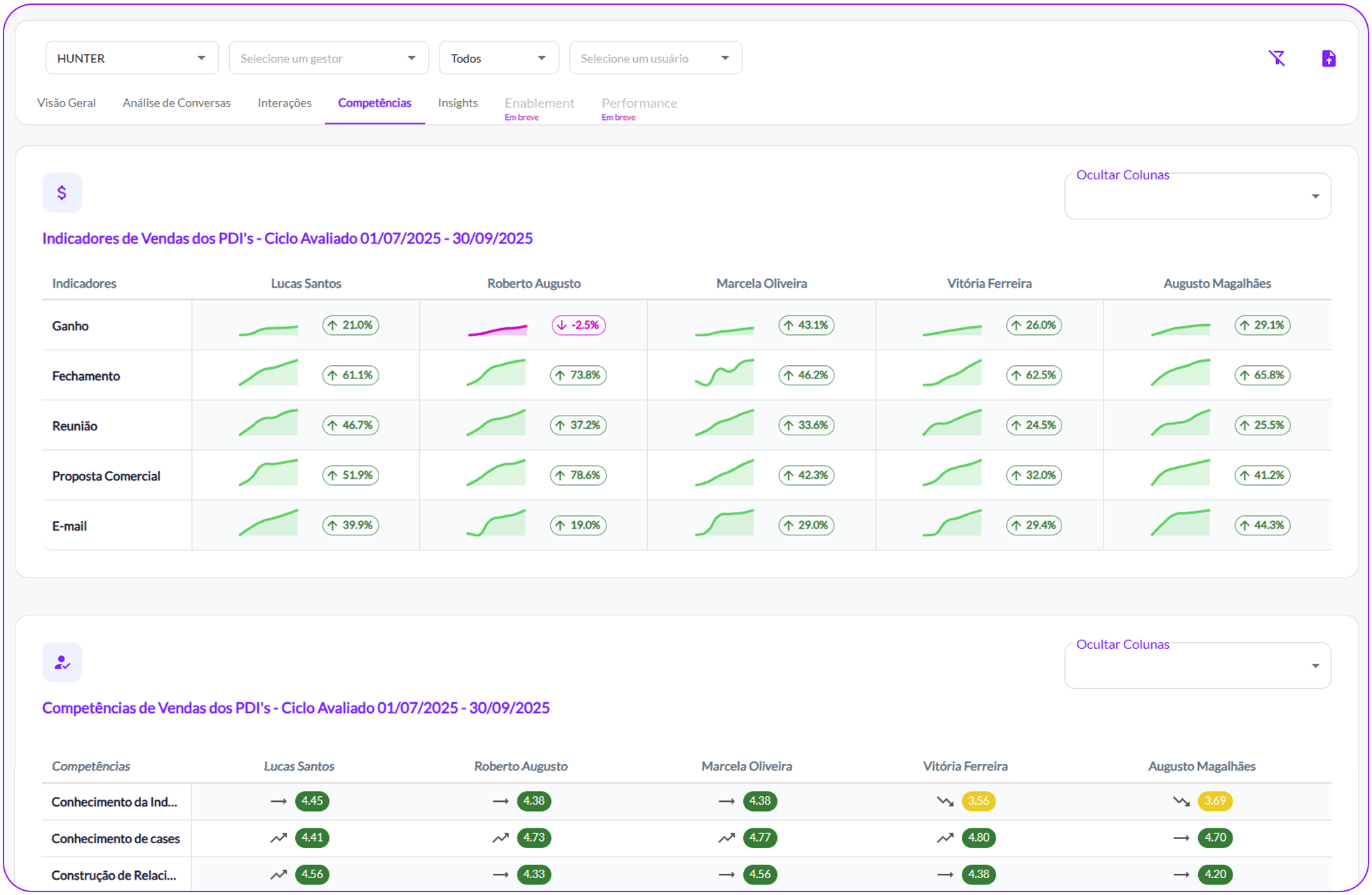 Aderência ao processo, qualidade da abordagem consultiva e evolução do discurso de vendas, marketing e produto.
