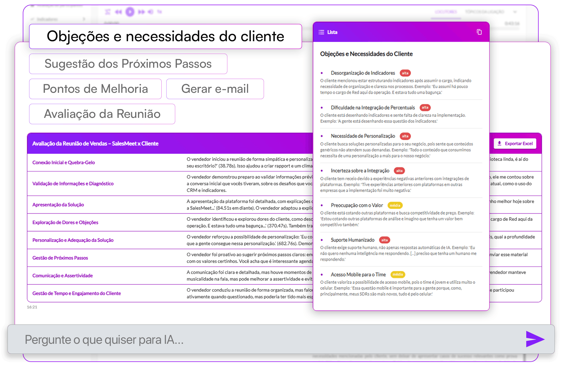 Unimos 18 anos de experiência em consultoria de Vendas com o poder da IA para criar Check-ups que analisam cada interação com profundidade. A SalesMeet interpreta evidências quantitativas e qualitativas das conversas, revelando exatamente o que faz o vendedor atingir a alta performance.